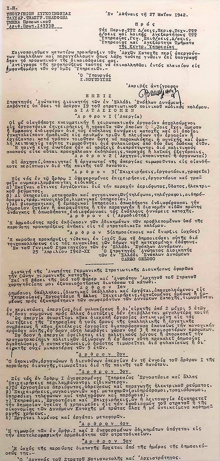 «Όταν η απεργία δημοσίων λειτουργών διενεργείται του κράτους διατελούντος υπό εξαιρετικάς συνθήκας και περιστάσεις αποτελεί ιδιώνυμον έγκλημα τιμωρούμενον και δια της ποινής του θανάτου. Οι απεργούντες εισάγονται δι απ ευθείας κλήσεως εντός 24 ωρών ενώπιον εκτάκτου πενταμελούς Στρατοδικείου καταρτιζομένου δι αποφάσεως του Υπουργού της Εθνικής Αμύνης. Κατά της εκδιδομένης αποφάσεως ουδέν ένδικον μέσον επιτρέπεται, εκτελείται δ αυτής εντός 24 ωρών από της εκδόσεώς της.» «Ελεύθερον Βήμα», 18 Απριλίου 1942.