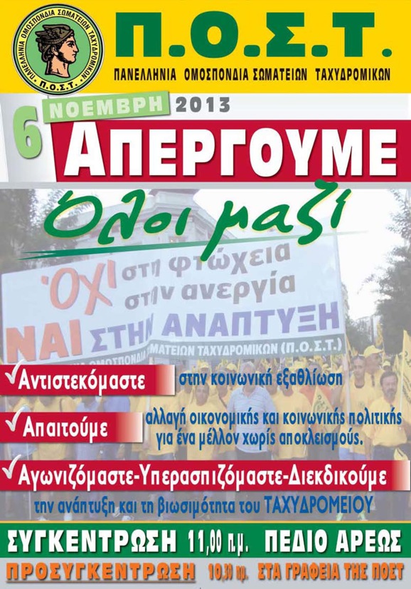 Η Πανελλήνια Ομοσπονδία Σωματείων Ταχυδρομικών και οι εργαζόμενοι στον ΕΛΤΑ συμμετέχουμε μαζικά και αγωνιστικά στη Γενική Απεργία που κήρυξε η ΓΣΕΕ, την Τετάρτη 6 Νοέμβρη 2013 και στην συγκέντρωση που πραγματοποιείται στο Πεδίον Άρεως.