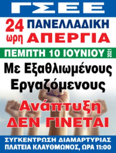 Η Πανελλήνια Ομοσπονδία Σωματείων Ταχυδρομικών συμμετέχει στην 24ωρη Γενική Απεργία που κήρυξε η ΓΣΕΕ, την Πέμπτη 10 Ιουνίου 2021 και στη συγκέντρωση διαμαρτυρίας στην πλατεία Κλαυθμώνος στις 11.00 π.μ.