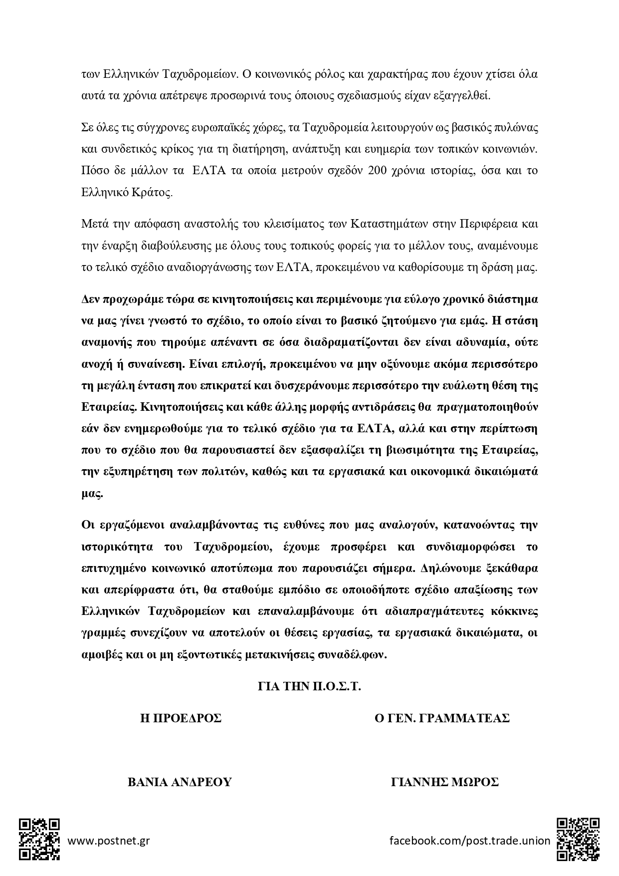 Ανακοίνωση της Π.Ο.Σ.Τ. για τα ΕΛΤΑ