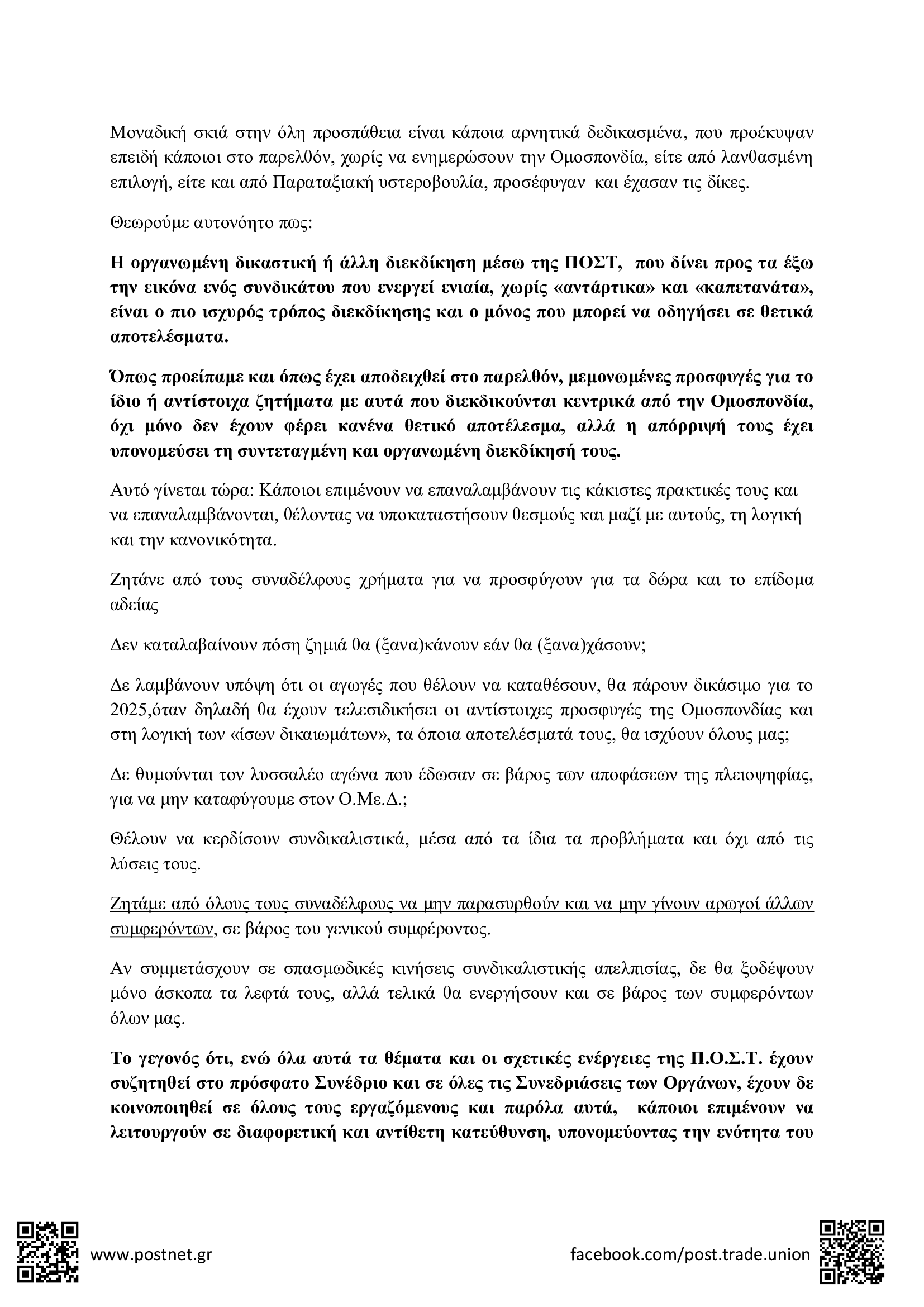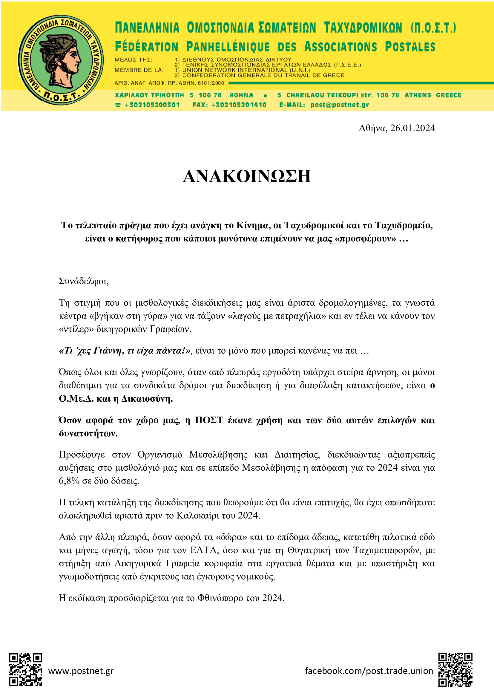 ΑΝΑΚΟΙΝΩΣΕΙΣ • 26 ΙΑΝΟΥΑΡΙΟΥ 2024Ανακοίνωση: Το τελευταίο πράγμα που έχει ανάγκη το Κίνημα, οι Ταχυδρομικοί και το Ταχυδρομείο, είναι ο κατήφορος που κάποιοι μονότονα επιμένουν να μας «προσφέρουν» …