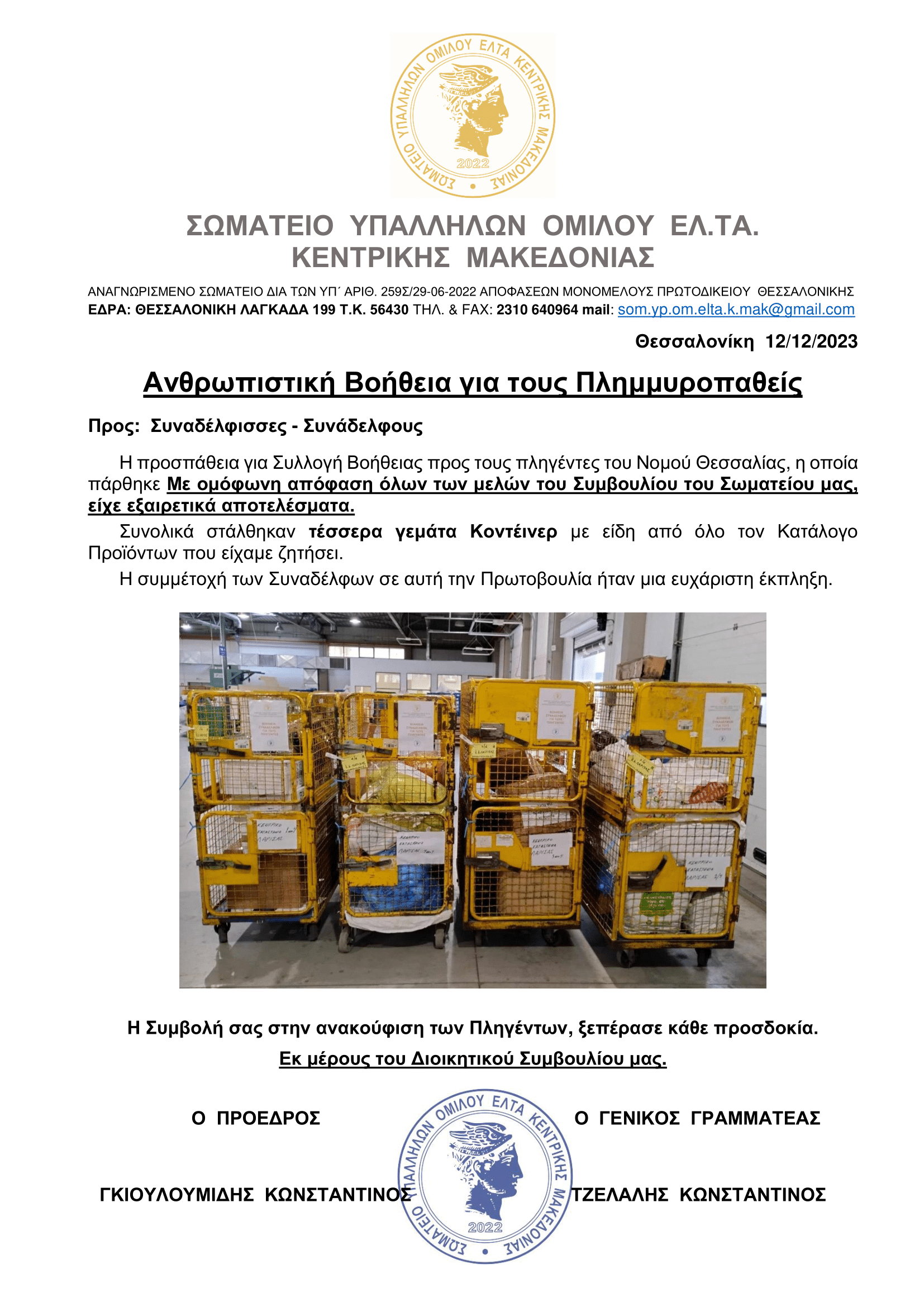 ΝΕΑ ΣΩΜΑΤΕΙΩΝ • 12 ΔΕΚΕΜΒΡΙΟΥ 2023Αποστολή βοήθειας στους πληγέντες της Θεσσαλίας από το Σωματείο Κεντρικής Μακεδονίας