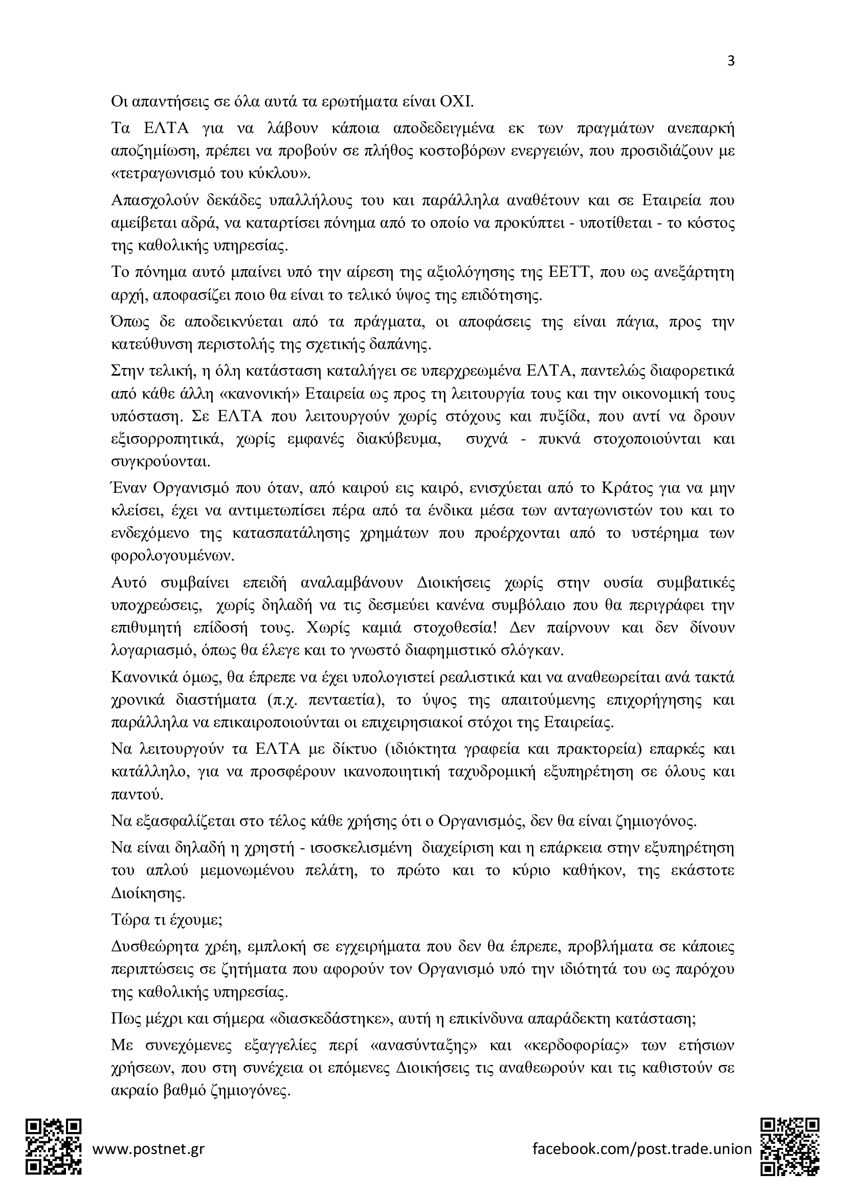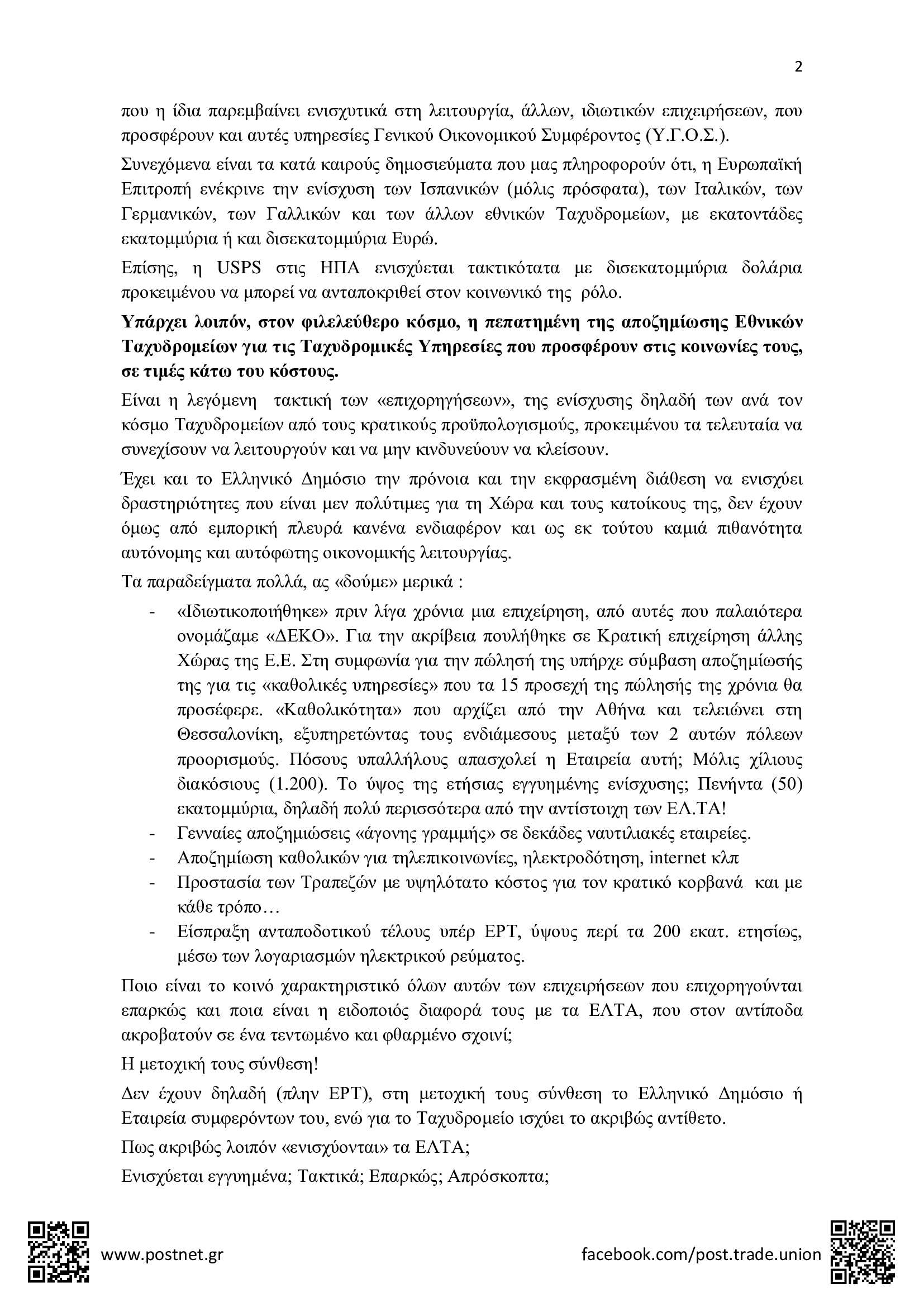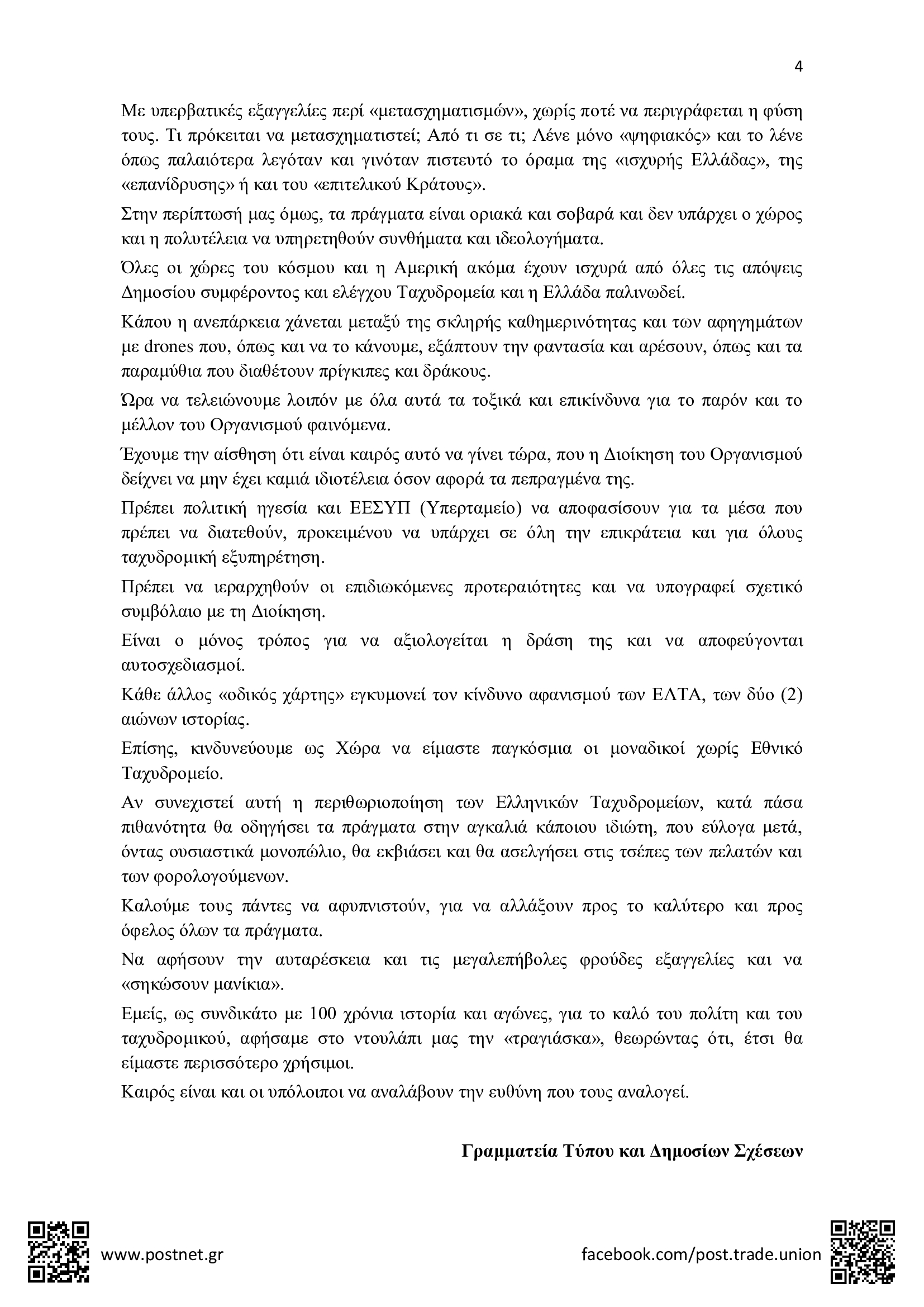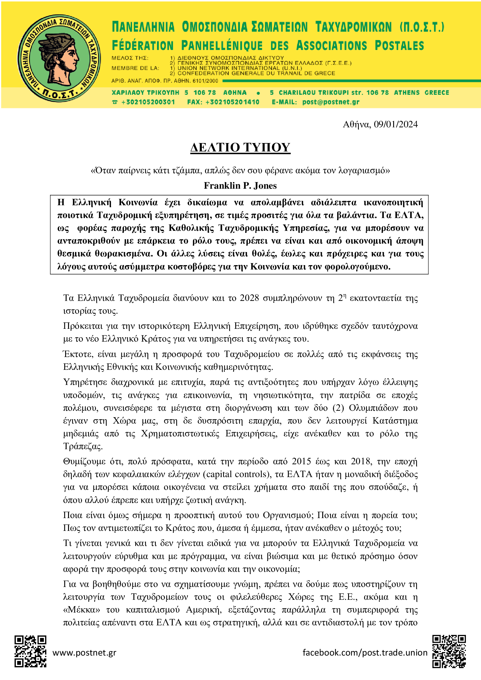 ΔΕΛΤΙΑ ΤΥΠΟΥ • 9 ΙΑΝΟΥΑΡΙΟΥ 2024Δελτίο Τύπου της Π.Ο.Σ.Τ. για την υποχρηματοδότηση της Καθολικής Ταχυδρομικής Υπηρεσίας και τα σοβαρά προβλήματα που δημιουργεί στη λειτουργία των ΕΛΤΑ