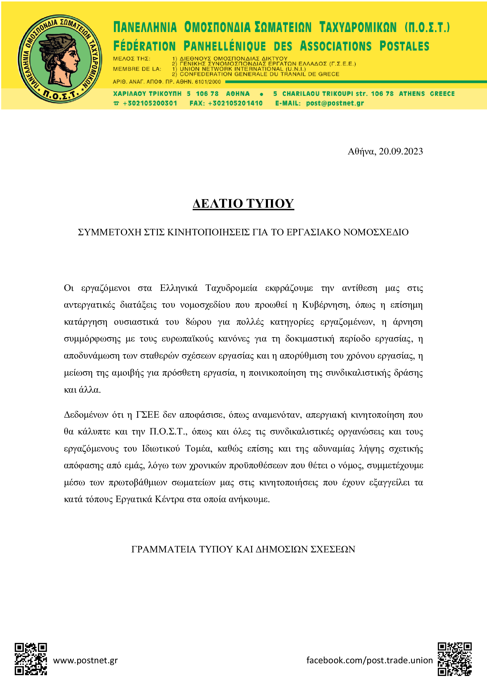 ΔΕΛΤΙΑ ΤΥΠΟΥ • 20 ΣΕΠΤΕΜΒΡΙΟΥ 2023Δελτίο τύπου της Π.Ο.Σ.Τ. για το εργασιακό νομοσχέδιο και τις εργατικές κινητοποιήσεις
