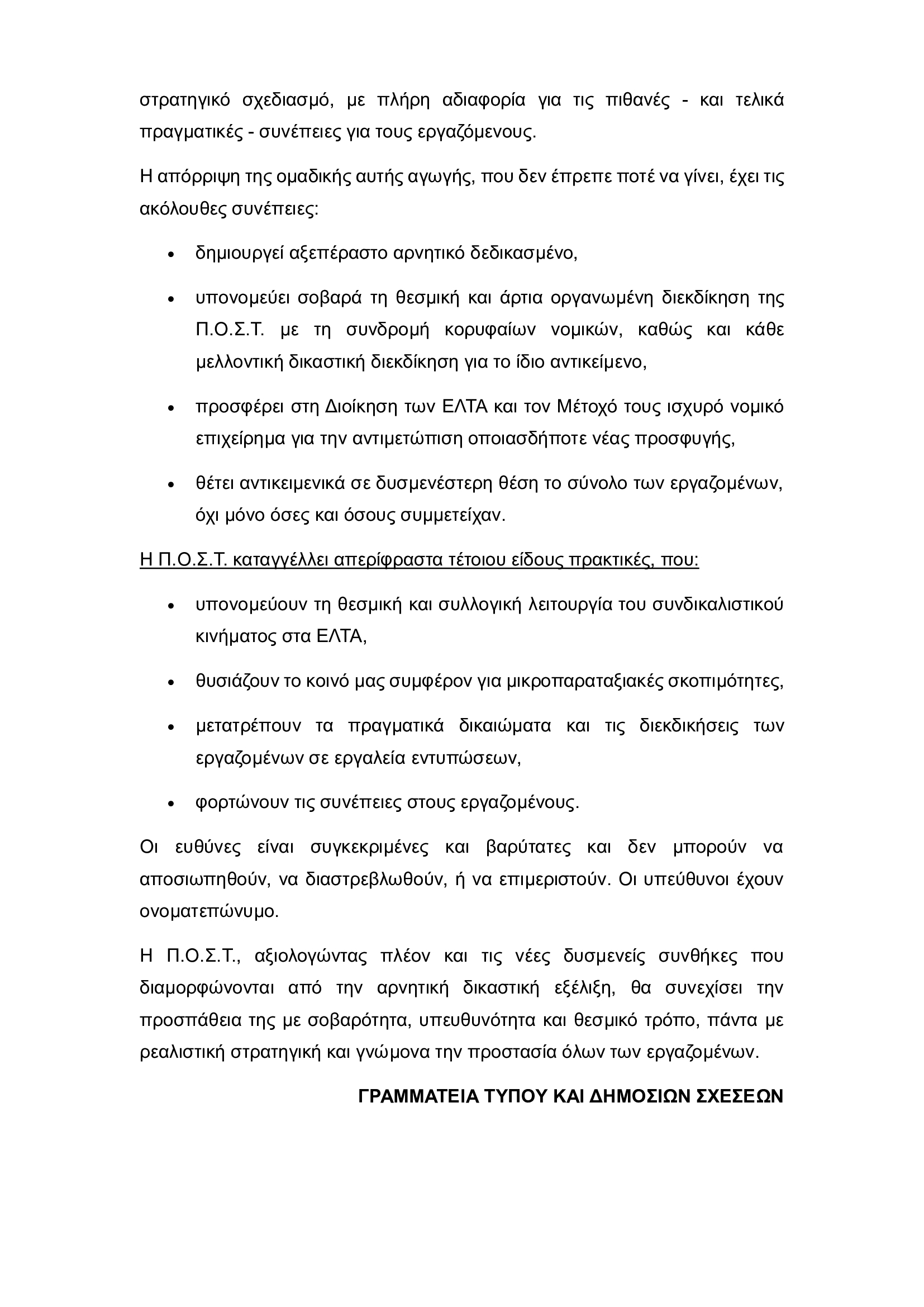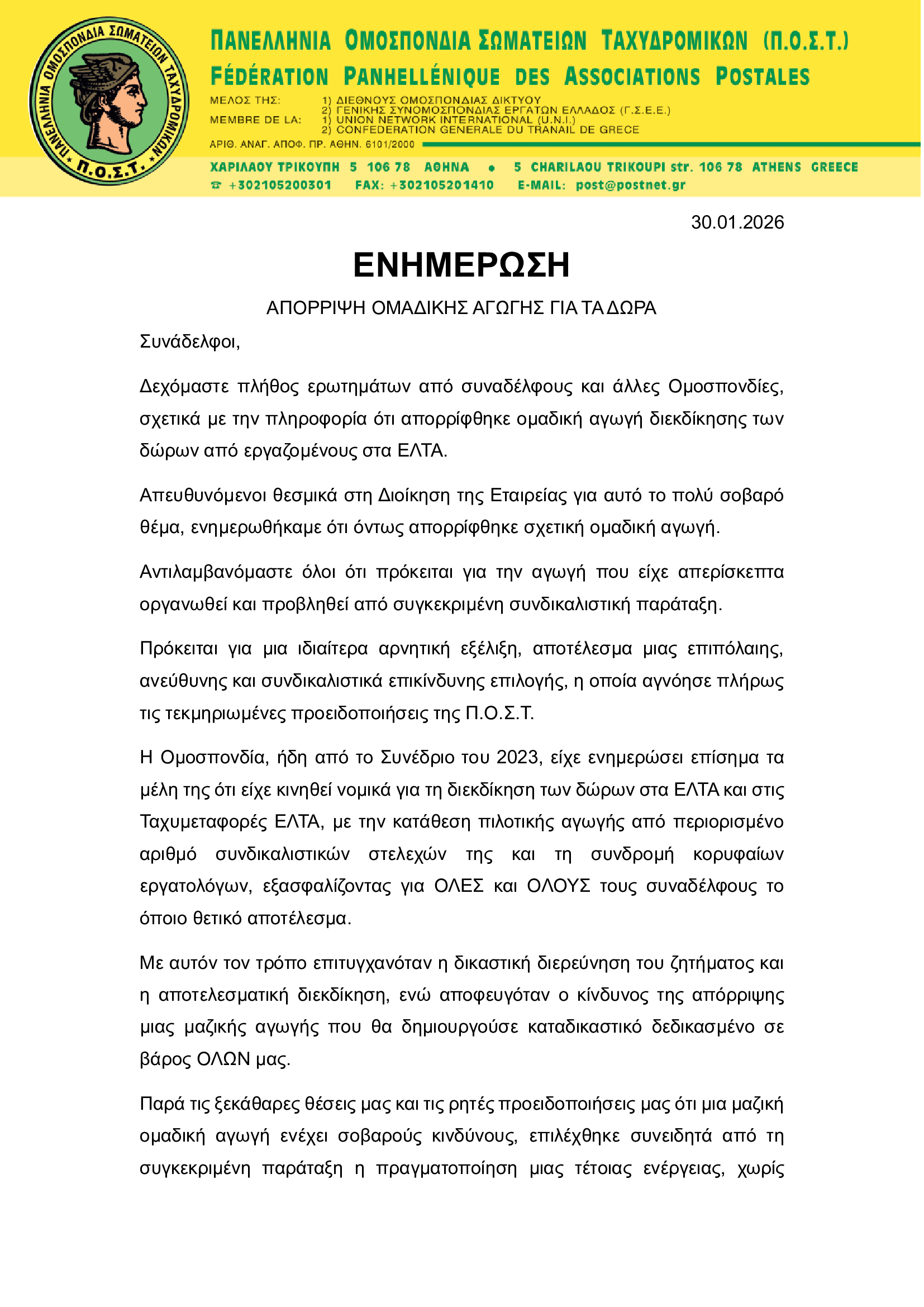 ΠΑΝΕΛΛΗΝΙΑ ΟΜΟΣΠΟΝΔΙΑ ΣΩΜΑΤΕΙΩΝ ΤΑΧΥΔΡΟΜΙΚΩΝ Π.Ο.Σ.Τ. :: Χαριλάου Τρικούπη 5, Αθήνα, 106 78 :: E-Mail: [email protected] :: Τηλέφωνο: 210 5200301