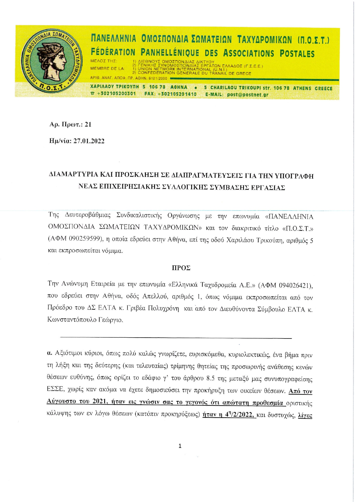 Της Δευτεροβάθμιας Συνδικαλιστικής Οργάνωσης με την επωνυμία «ΠΑΝΕΛΛΗΝΙΑ ΟΜΟΣΠΟΝΔΙΑ ΣΩΜΑΤΕΙΩΝ ΤΑΧΥΔΡΟΜΙΚΩΝ» και τον διακριτικό τίτλο «Π.Ο.Σ.Τ.» (ΑΦΜ 090259599), η οποία εδρεύει στην Αθήνα, επί της οδού Χαριλάου Τρικούπη, αριθμός 5 και εκπροσωπείται νόμιμα.