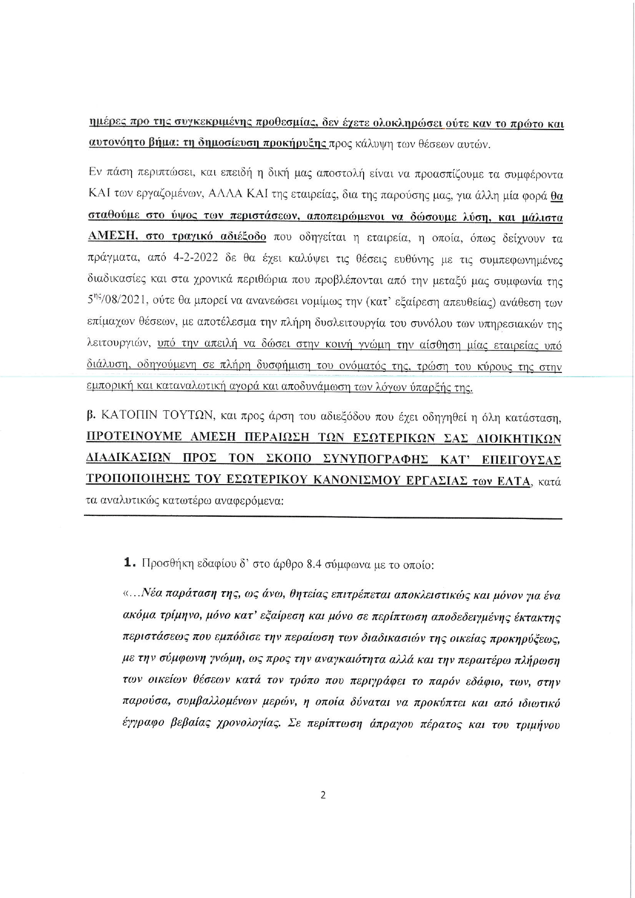 β. ΚΑΤΟΠΙΝ ΤΟΥΤΩΝ, και προς άρση του αδιεξόδου που έχει οδηγηθεί η όλη κατάσταση, ΠΡΟΤΕΙΝΟΥΜΕ ΑΜΕΣΗ ΠΕΡΑΙΩΣΗ ΤΩΝ ΕΣΩΤΕΡΙΚΩΝ ΣΑΣ ΔΙΟΙΚΗΤΙΚΩΝ ΔΙΑΔΙΚΑΣΙΩΝ ΠΡΟΣ ΤΟΝ ΣΚΟΠΟ ΣΥΝΥΠΟΓΡΑΦΗΣ ΚΑΤ’ ΕΠΕΙΓΟΥΣΑΣ ΤΡΟΠΟΠΟΙΗΣΗΣ ΤΟΥ ΕΣΩΤΕΡΙΚΟΥ ΚΑΝΟΝΙΣΜΟΥ ΕΡΓΑΣΙΑΣ των ΕΛΤΑ, κατά τα αναλυτικώς κατωτέρω αναφερόμενα:
