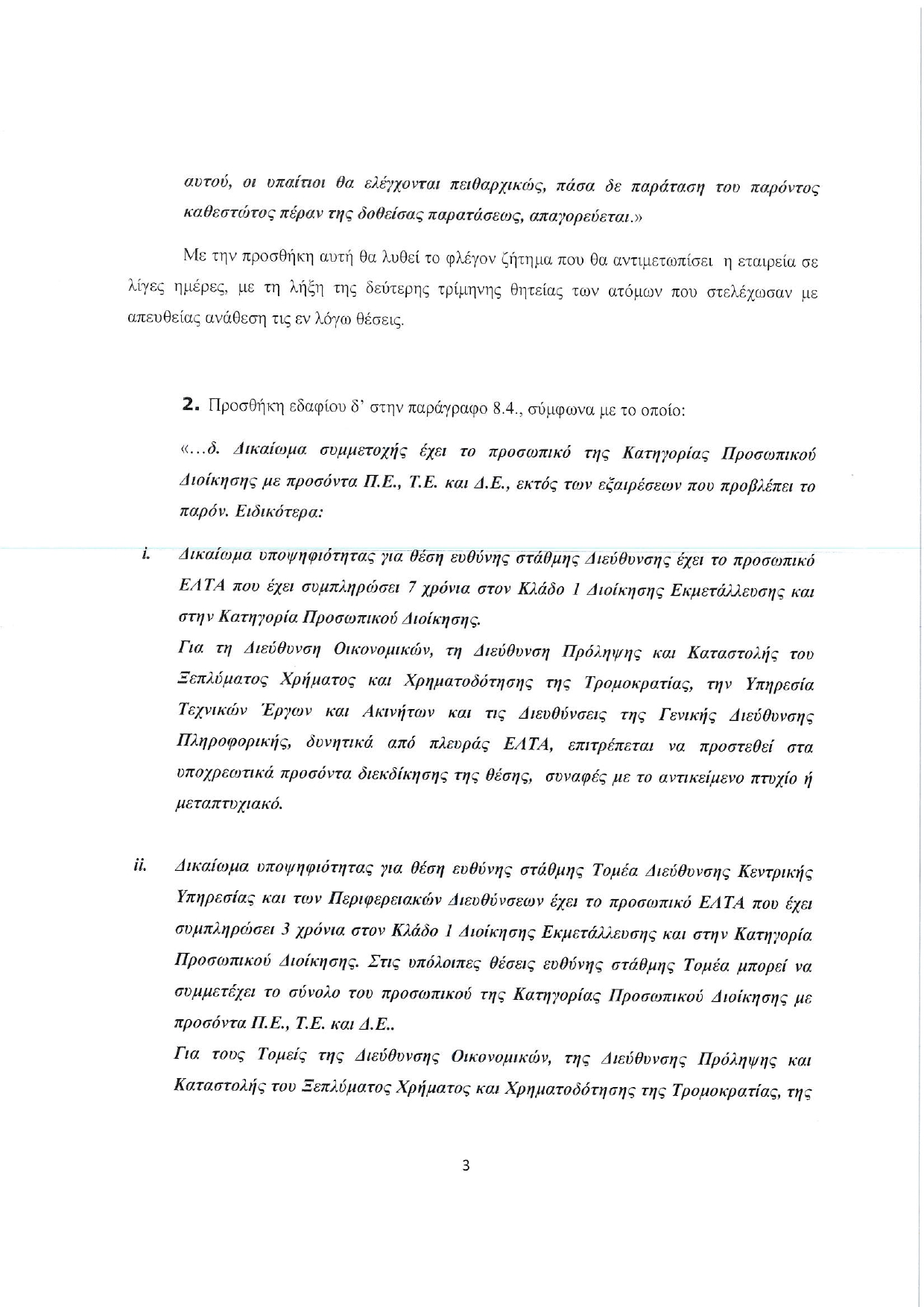 iii. Δικαίωμα υποψηφιότητας για θέση ευθύνης στάθμης Τμήματος και ειδικών θέσεων της κατηγορίας Β.3.3 και Β.3.4 της παραγράφου 8.6 του Εσωτερικού Κανονισμού Εργασίας έχει το σύνολο των εργαζομένων της Κατηγορίας Προσωπικού Διοίκησης.
