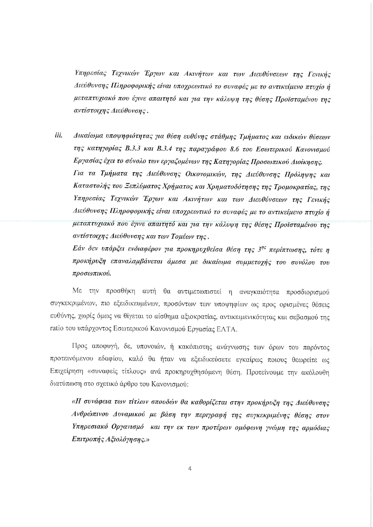 Προς αποφυγή, δε, υπονοιών, ή κακόπιστης ανάγνωσης των όρων του παρόντος προτεινόμενου εδαφίου, καλό θα ήταν να εξειδικεύσετε εγκαίρως ποιους θεωρείτε ως Επιχείρηση «συναφείς τίτλους» ανά προκηρυχθησόμενη θέση. Προτείνουμε την ακόλουθη διατύπωση στο σχετικό άρθρο του Κανονισμού: