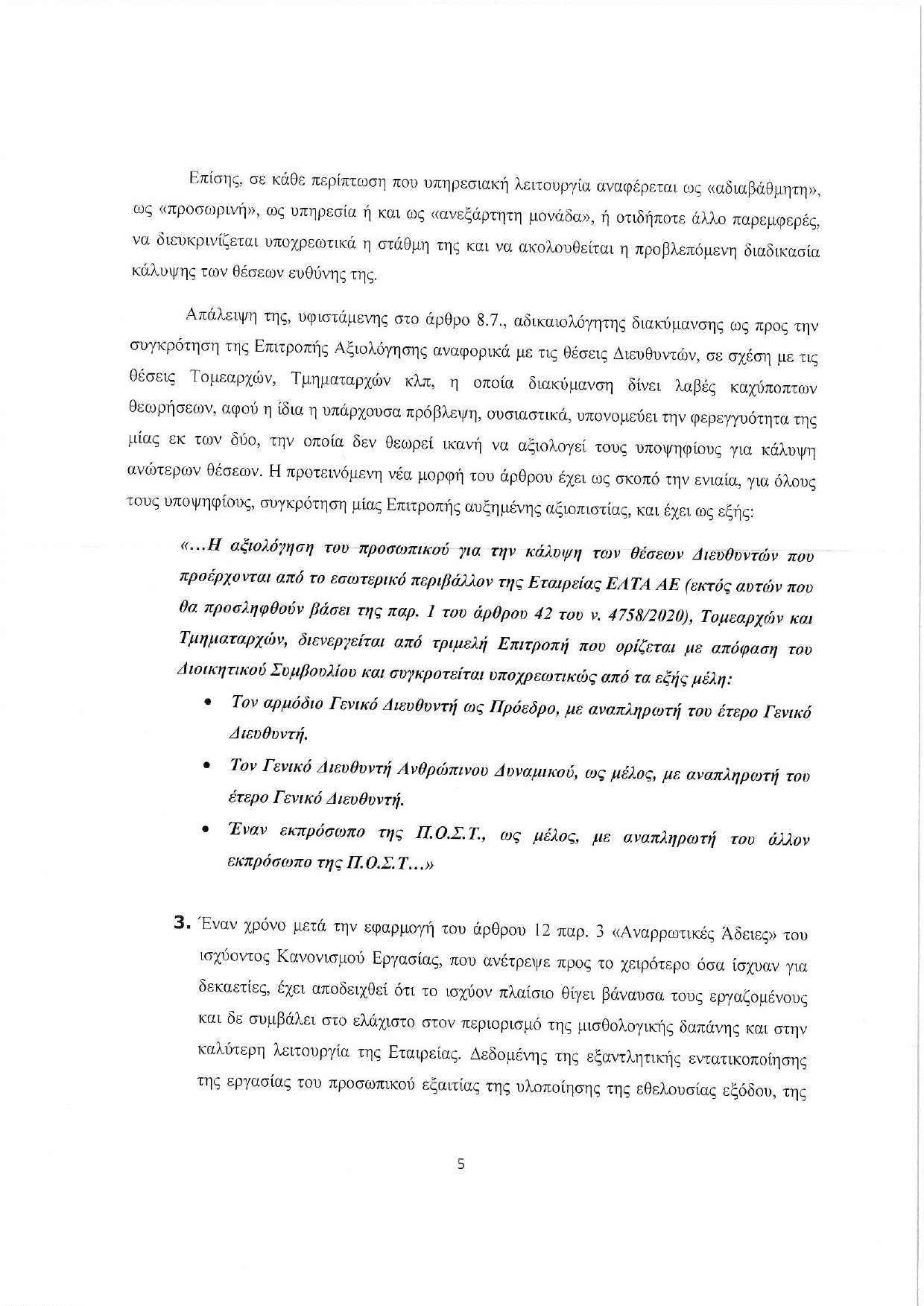 «…Η αξιολόγηση του προσωπικού για την κάλυψη των θέσεων Διευθυντών που προέρχονται από το εσωτερικό περιβάλλον της Εταιρείας ΕΛΤΑ ΑΕ (εκτός αυτών που θα προσληφθούν βάσει της παρ. 1 του άρθρου 42 του ν. 4758/2020), Τομεαρχών και Τμηματαρχών, διενεργείται από τριμελή Επιτροπή που ορίζεται με απόφαση του Διοικητικού Συμβουλίου και συγκροτείται υποχρεωτικώς από τα εξής μέλη: