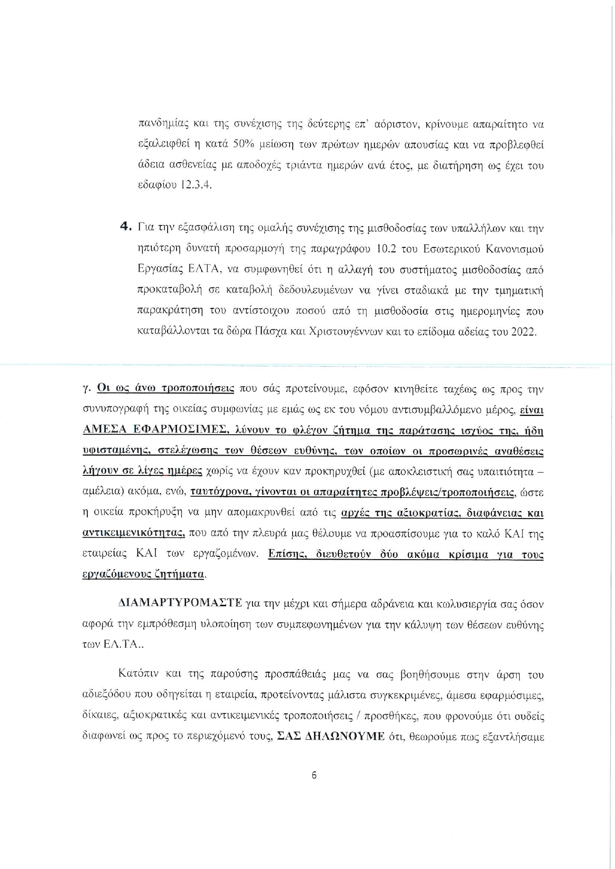 γ. Οι ως άνω τροποποιήσεις που σάς προτείνουμε, εφόσον κινηθείτε ταχέως ως προς την συνυπογραφή της οικείας συμφωνίας με εμάς ως εκ του νόμου αντισυμβαλλόμενο μέρος, είναι ΑΜΕΣΑ ΕΦΑΡΜΟΣΙΜΕΣ, λύνουν το φλέγον ζήτημα της παράτασης ισχύος της, ήδη υφισταμένης, στελέχωσης των θέσεων ευθύνης, των οποίων οι προσωρινές αναθέσεις λήγουν σε λίγες ημέρες χωρίς να έχουν καν προκηρυχθεί (με αποκλειστική σας υπαιτιότητα – αμέλεια) ακόμα, ενώ, ταυτόχρονα, γίνονται οι απαραίτητες προβλέψεις/τροποποιήσεις, ώστε η οικεία προκήρυξη να μην απομακρυνθεί από τις αρχές της αξιοκρατίας, διαφάνειας και αντικειμενικότητας, που από την πλευρά μας θέλουμε να προασπίσουμε για το καλό ΚΑΙ της εταιρείας ΚΑΙ των εργαζομένων. Επίσης, διευθετούν δύο ακόμα κρίσιμα για τους εργαζόμενους ζητήματα.