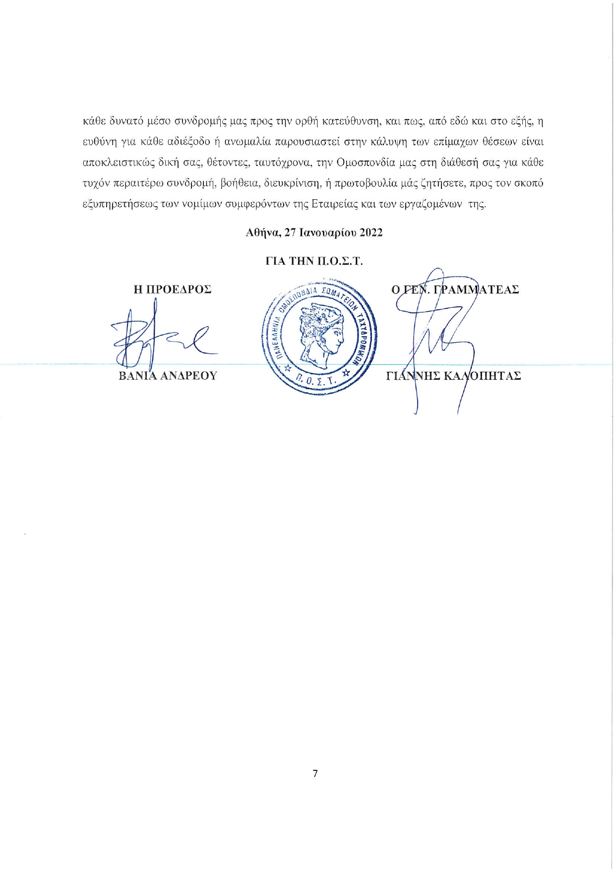 Κατόπιν και της παρούσης προσπάθειάς μας να σας βοηθήσουμε στην άρση του αδιεξόδου που οδηγείται η εταιρεία, προτείνοντας μάλιστα συγκεκριμένες, άμεσα εφαρμόσιμες, δίκαιες, αξιοκρατικές και αντικειμενικές τροποποιήσεις / προσθήκες, που φρονούμε ότι ουδείς διαφωνεί ως προς το περιεχόμενό τους, ΣΑΣ ΔΗΛΩΝΟΥΜΕ ότι, θεωρούμε πως εξαντλήσαμε κάθε δυνατό μέσο συνδρομής μας προς την ορθή κατεύθυνση, και πως, από εδώ και στο εξής, η ευθύνη για κάθε αδιέξοδο ή ανωμαλία παρουσιαστεί στην κάλυψη των επίμαχων θέσεων είναι αποκλειστικώς δική σας, θέτοντες, ταυτόχρονα, την Ομοσπονδία μας στη διάθεσή σας για κάθε τυχόν περαιτέρω συνδρομή, βοήθεια, διευκρίνιση, ή πρωτοβουλία μάς ζητήσετε, προς τον σκοπό εξυπηρετήσεως των νομίμων συμφερόντων της Εταιρείας και των εργαζομένων της.