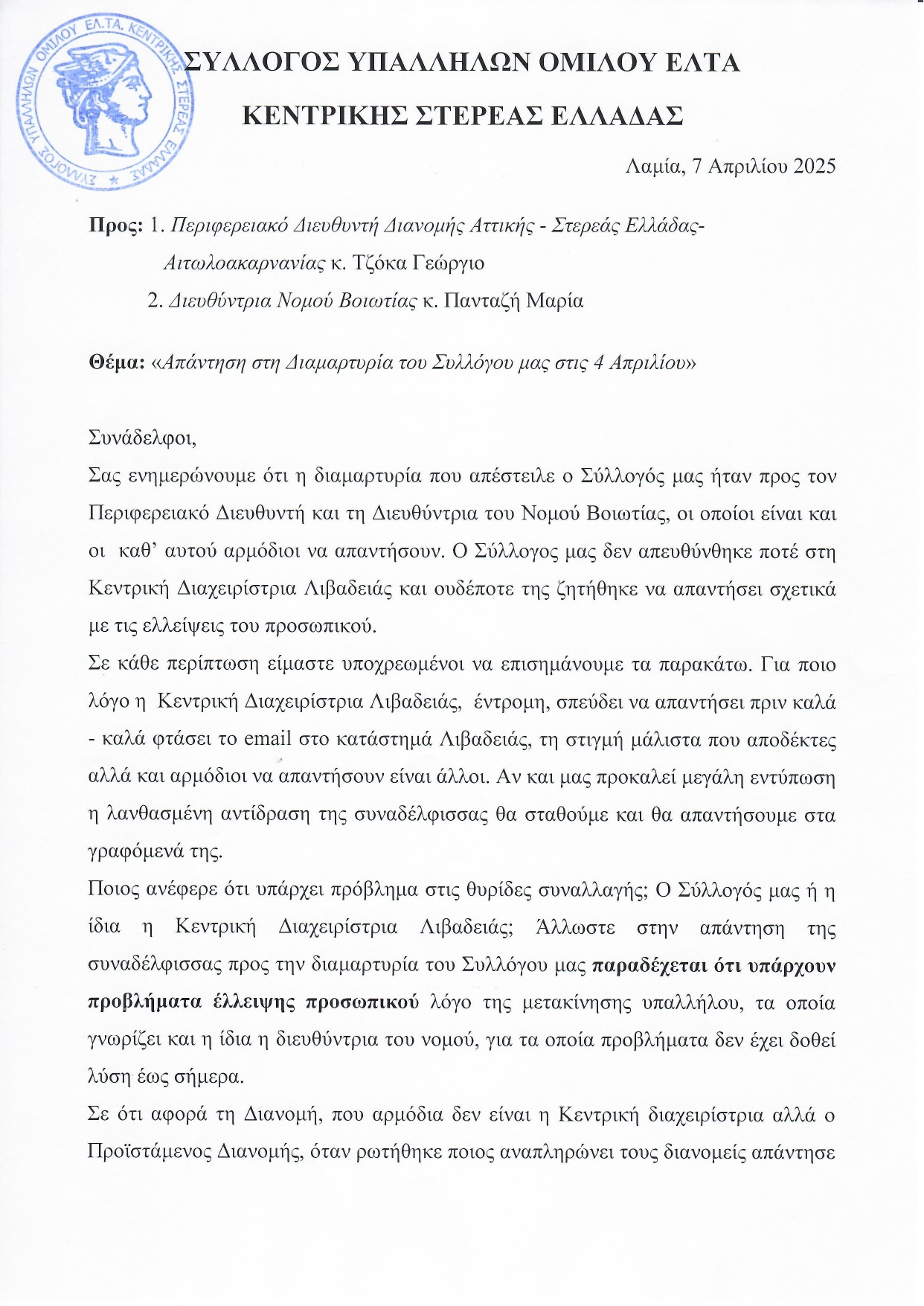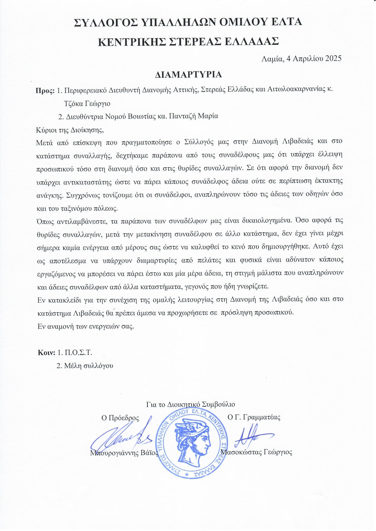 ΣΩΜΑΤΕΙΑ • ΜΕΛΗ • 4 ΜΑΪΟΥ 2025Διαμαρτυρία Συλλόγου Υπαλλήλων Ομίλου ΕΛΤΑ Κεντρικής Στερεάς Ελλάδας για τις ελλείψεις προσωπικού