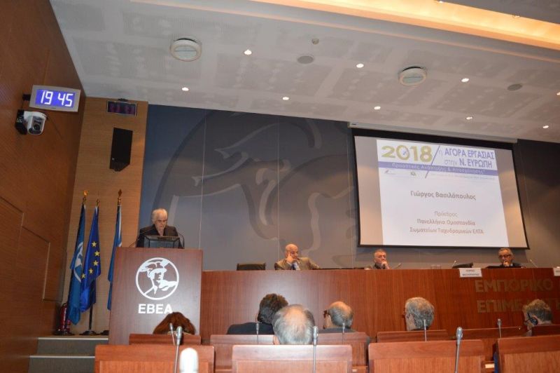 Ο Πρόεδρος της ΠΟΣΤ Γιώργος Βασιλόπουλος στην ομιλία του αναφέρθηκε στα τεράστια προβλήματα που προκαλούνται στη αγορά και στον κόσμο της εργασίας στις χώρες της Ν. Ευρώπης και ιδιαίτερα στην Ελλάδα, εξαιτίας των τεκτονικών αλλαγών της παγκοσμιοποίησης, των ραγδαίων τεχνολογικών εξελίξεων και βέβαια της παρατεταμένης οικονομικής κρίσης.