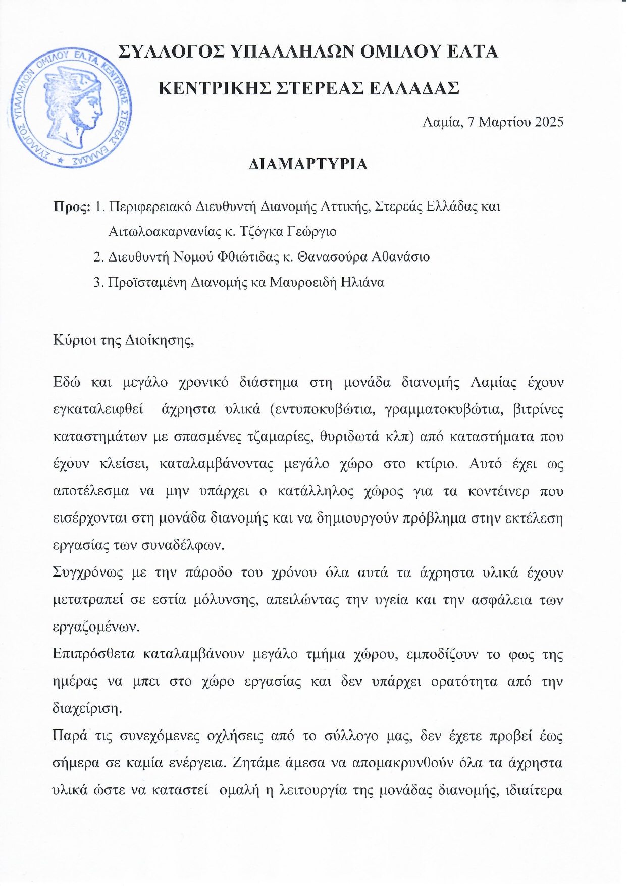 ΝΕΑ ΣΩΜΑΤΕΙΩΝ • 7 ΜΑΡΤΙΟΥ 2025Επιστολή διαμαρτυρίας Συλλόγου Υπαλλήλων Ομίλου ΕΛΤΑ Κεντρικής Στερεάς Ελλάδας