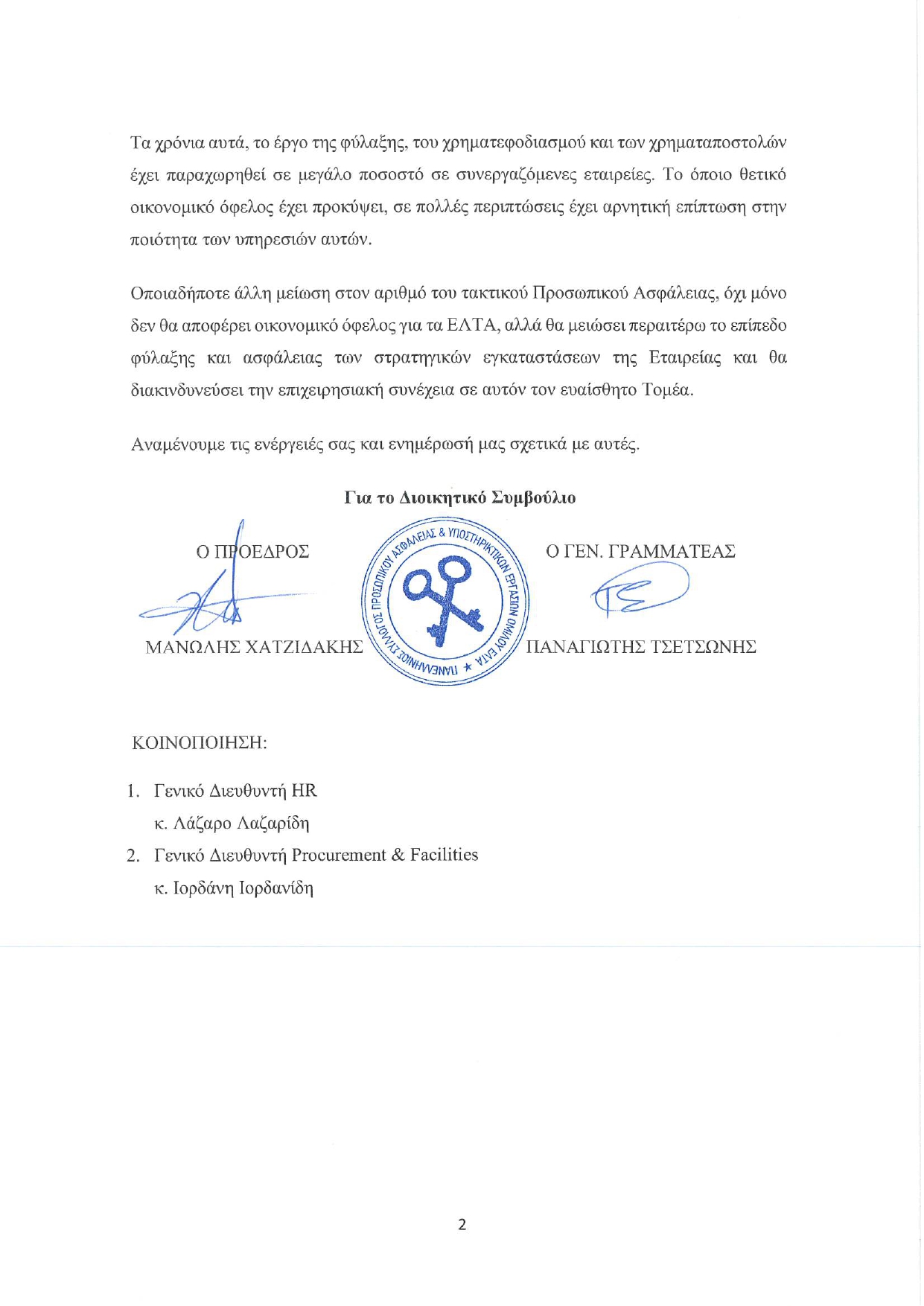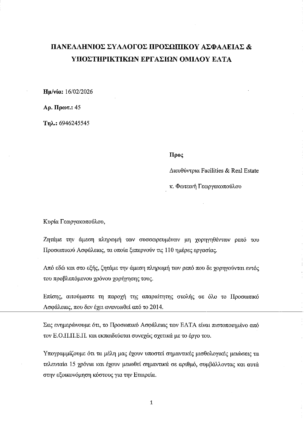 ΝΕΑ ΣΩΜΑΤΕΙΩΝ • 16 ΦΕΒΡΟΥΑΡΙΟΥ 2026Επιστολή Πανελληνίου Συλλόγου Προσωπικού Ασφαλείας & Υποστηρικτικών Εργασιών Ομίλου ΕΛΤΑ στη Διοίκηση ΕΛΤΑ