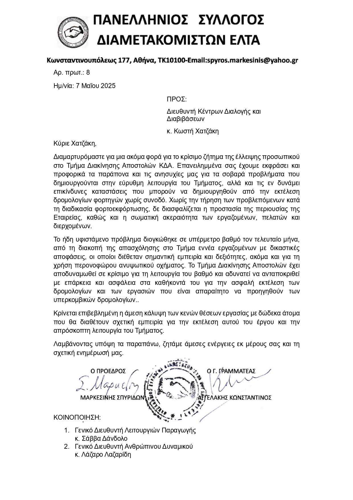 ΣΩΜΑΤΕΙΑ • ΜΕΛΗ • 7 ΜΑΪΟΥ 2025Επιστολή Πανελληνίου Συλλόγου Διαμετακομιστών ΕΛΤΑ για τις ελλείψεις προσωπικού