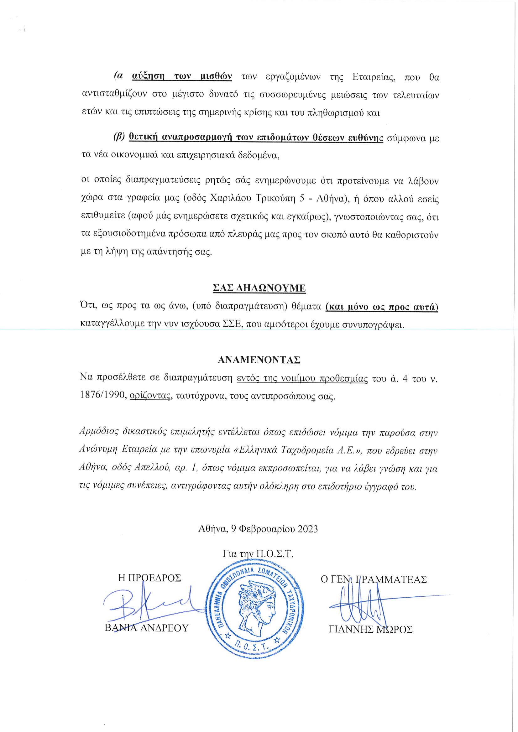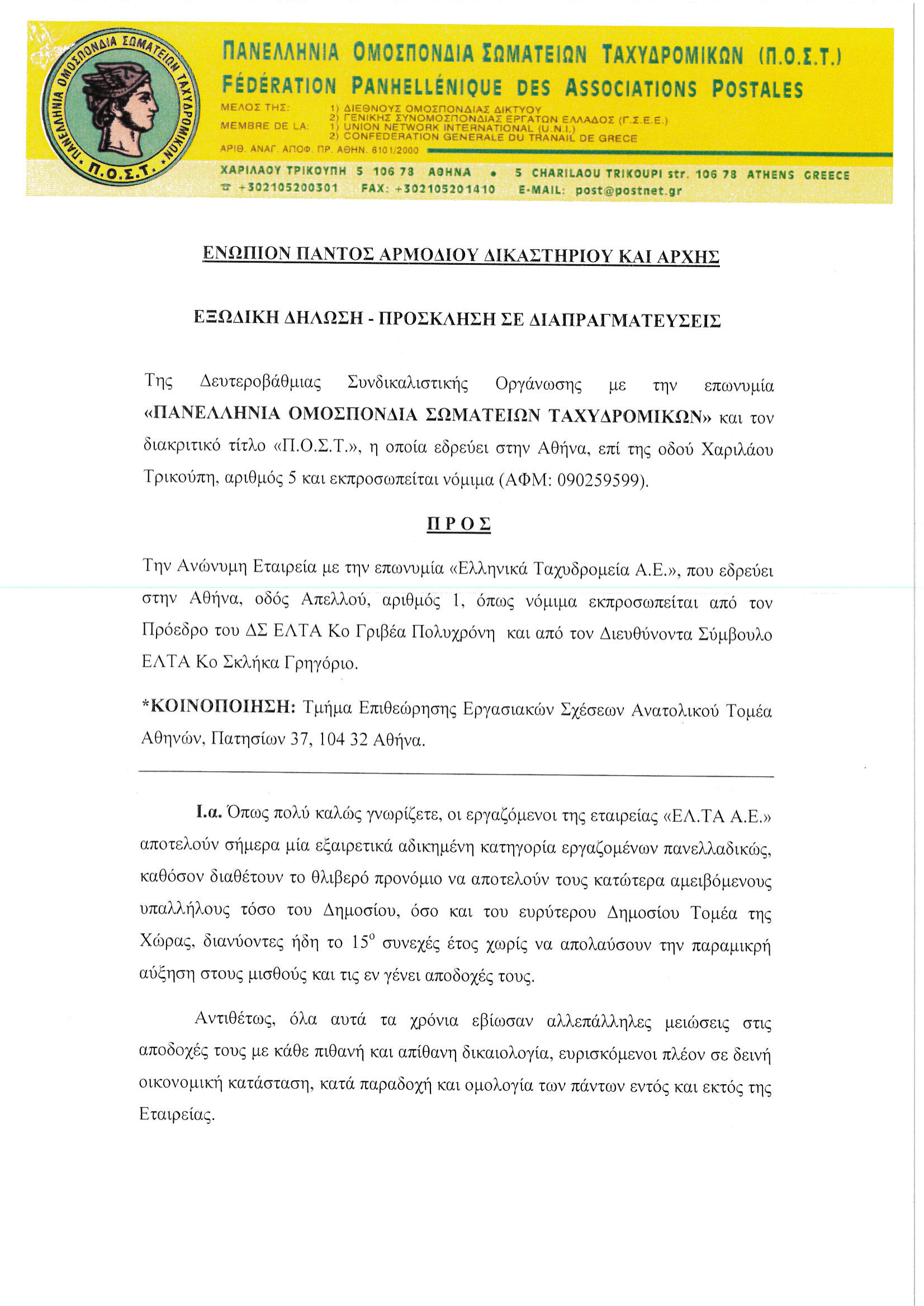 ΕΞΩΔΙΚΑ • 9 ΦΕΒΡΟΥΑΡΙΟΥ 2025Εξώδικη πρόσκληση της ΠΟΣΤ στη Διοίκηση ΕΛΤΑ για διαπραγματεύσεις για μισθολογικές αυξήσεις.