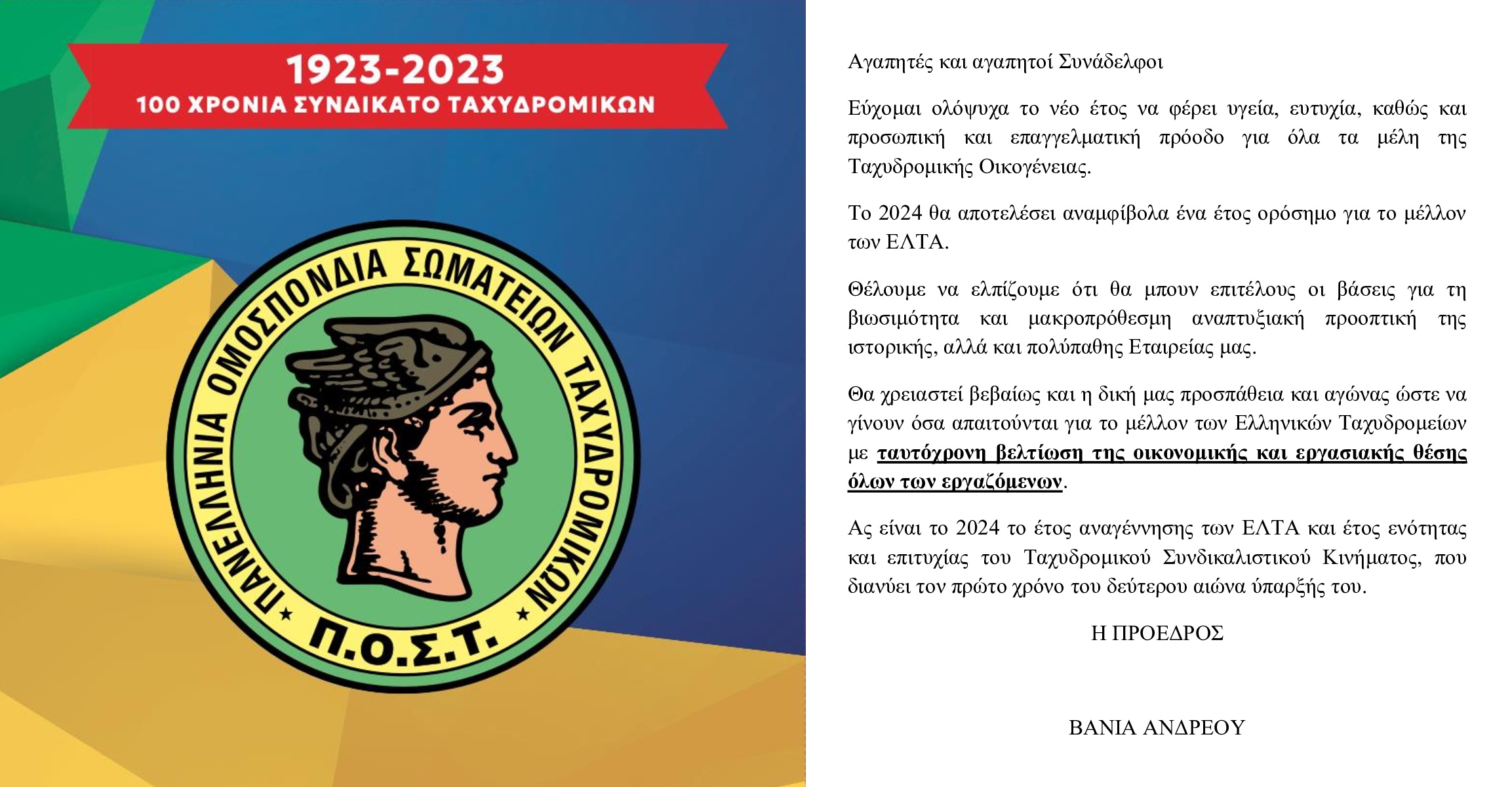 Ευχές από την Πρόεδρο της Π.Ο.Σ.Τ.