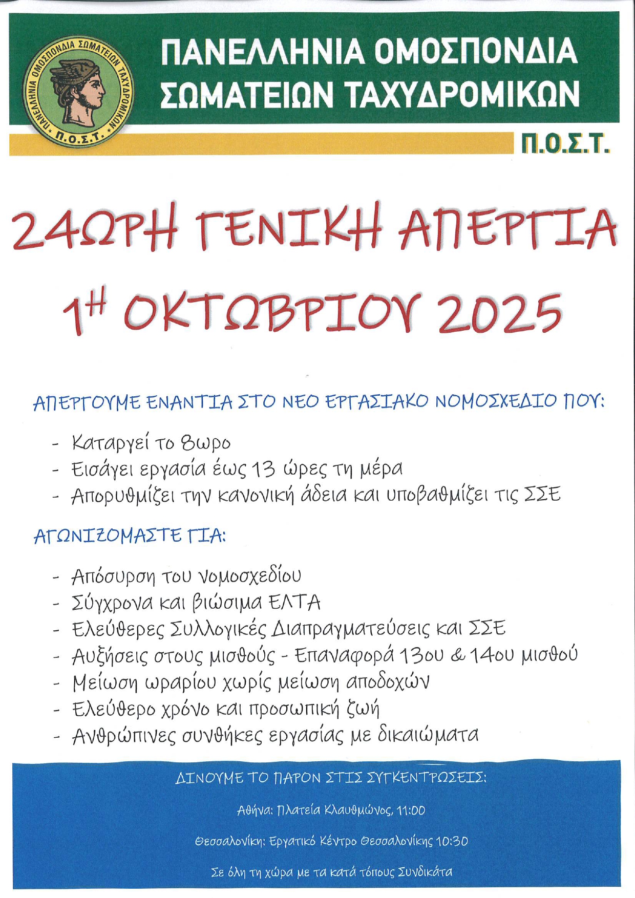 ΑΝΑΚΟΙΝΩΣΕΙΣ • 25 ΣΕΠΤΕΜΒΡΙΟΥ 2025Η Π.Ο.Σ.Τ. συμμετέχει στην 24ωρη Γενική Απεργία που κήρυξε η Γ.Σ.Ε.Ε. για την 1η Οκτώβρη