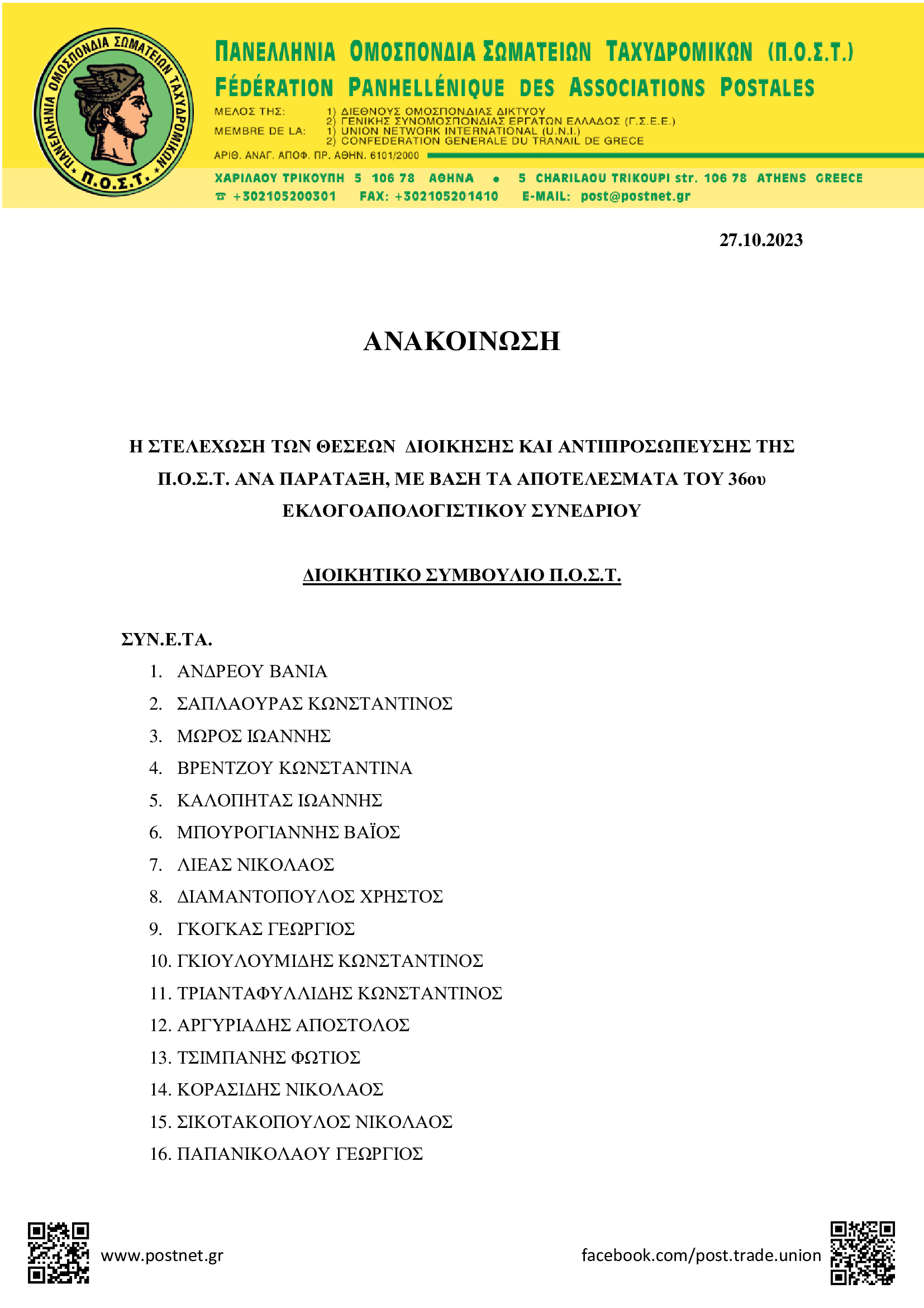 ΑΝΑΚΟΙΝΩΣΕΙΣ • 27 ΟΚΤΩΒΡΙΟΥ 2023Η στελέχωση των θέσεων Διοίκησης και Αντιπροσώπευσης της Π.Ο.Σ.Τ., ανά Παράταξη, με βάση τα αποτελέσματα του 36ου Εκλογοαπολογιστικού Συνεδρίου
