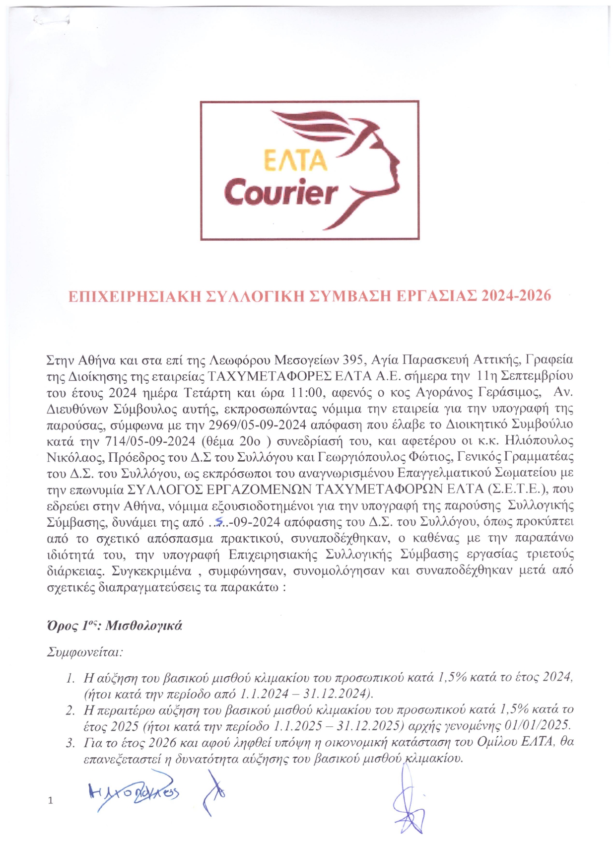 Υπογράφηκε στις 11.09.2024 μεταξύ Διοίκησης Ταχυμεταφορών και Συλλόγου Εργαζομένων Ταχυμεταφορών ΕΛΤΑ νέα επιχειρησιακή συλλογική σύμβαση εργασίας για τα έτη 2024 – 2026 η οποία περιλαμβάνει μισθολογικές αυξήσεις και προστασία του υφιστάμενου θεσμικού πλαισίου με σημαντικές βελτιώσεις.