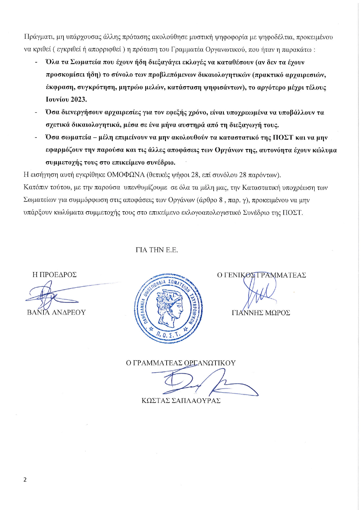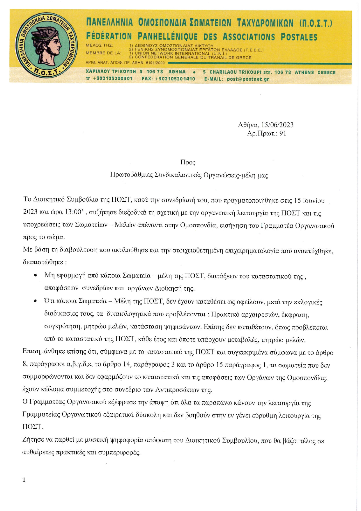 ΕΠΙΣΤΟΛΕΣ • 15 ΙΟΥΝΙΟΥ 2023ΣΗΜΑΝΤΙΚΟ! Επιστολή Π.Ο.Σ.Τ. στα Σωματεία μέλη της για συμμόρφωση με τις καταστατικές υποχρεώσεις τους ενόψει του Συνεδρίου της