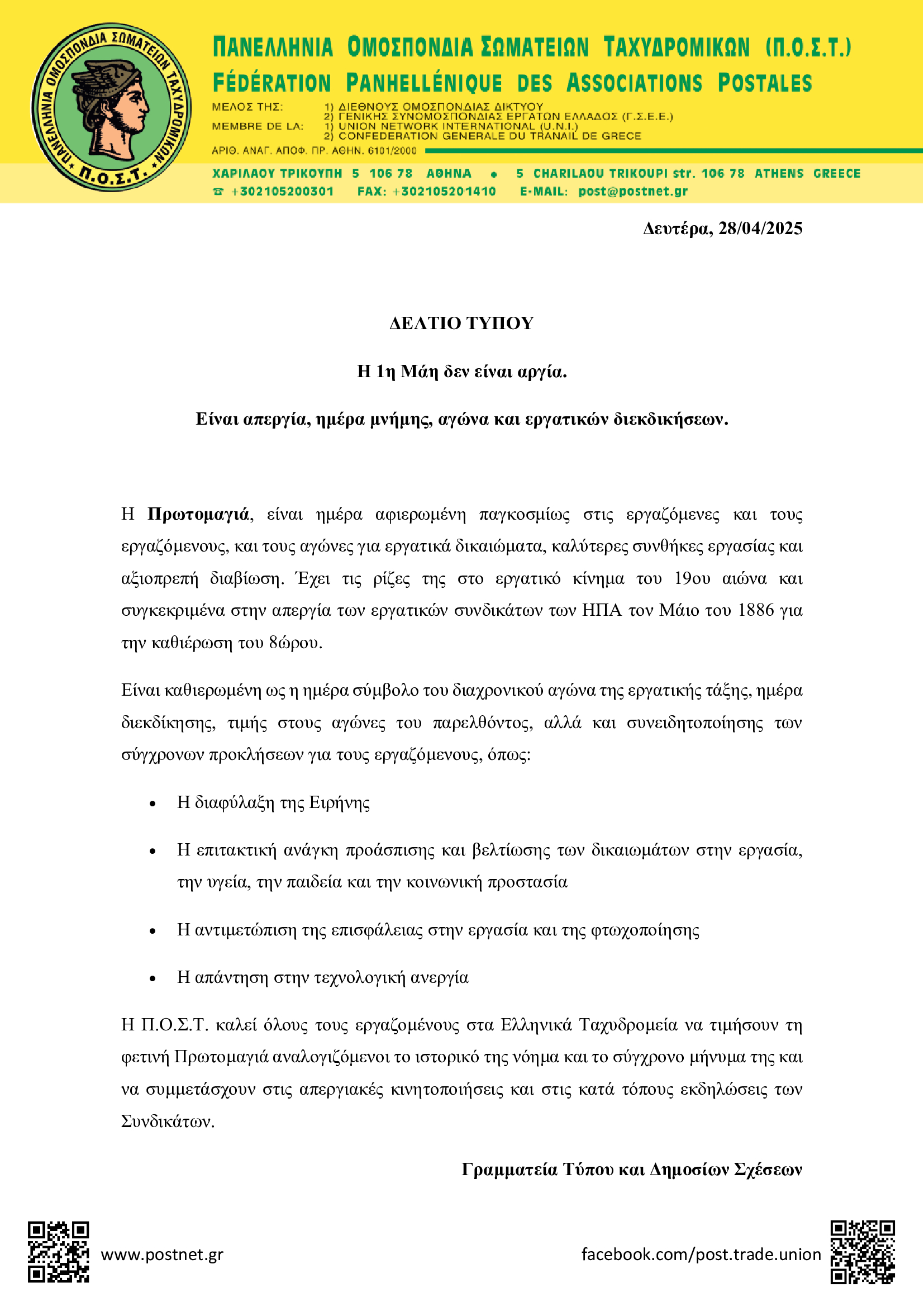 ΔΕΛΤΙΑ ΤΥΠΟΥ • 28 ΑΠΡΙΛΙΟΥ 2025