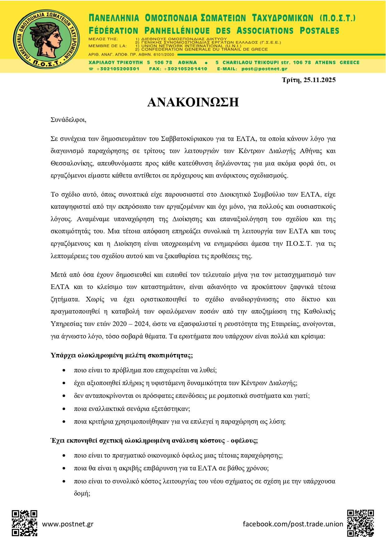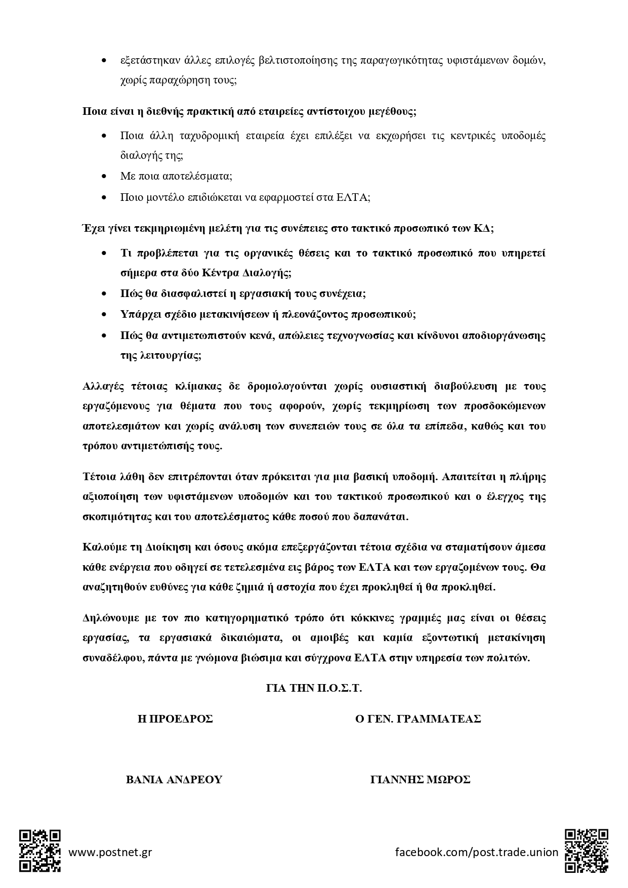 ΠΑΝΕΛΛΗΝΙΑ ΟΜΟΣΠΟΝΔΙΑ ΣΩΜΑΤΕΙΩΝ ΤΑΧΥΔΡΟΜΙΚΩΝ Π.Ο.Σ.Τ. :: Χαριλάου Τρικούπη 5, Αθήνα, 106 78 :: E-Mail: [email protected] :: Τηλέφωνο: 210 5200301
