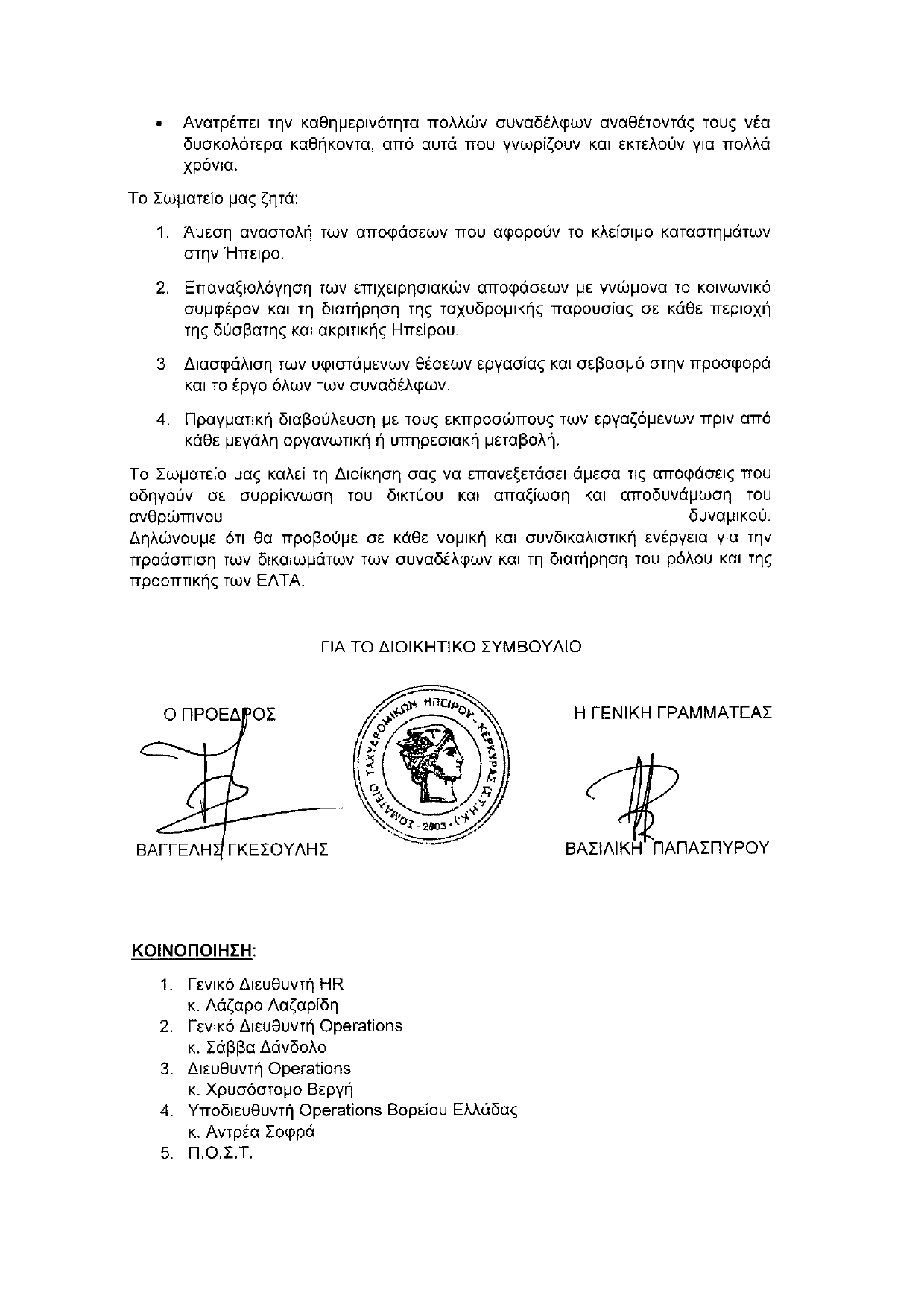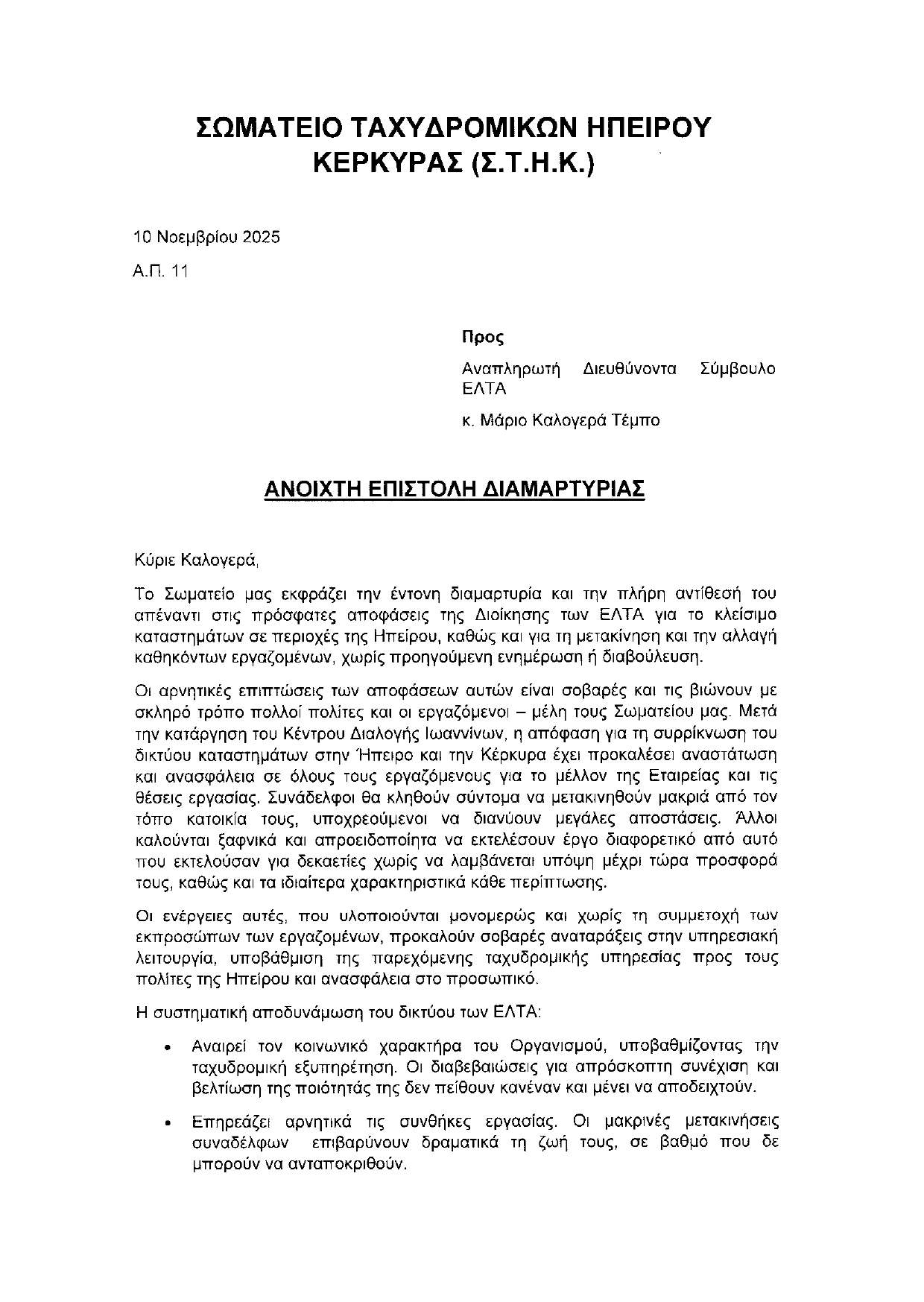 Ανοιχτή Επιστολή Διαμαρτυρίας Σωματείου Ταχυδρομικών Ηπείρου Κερκύρας