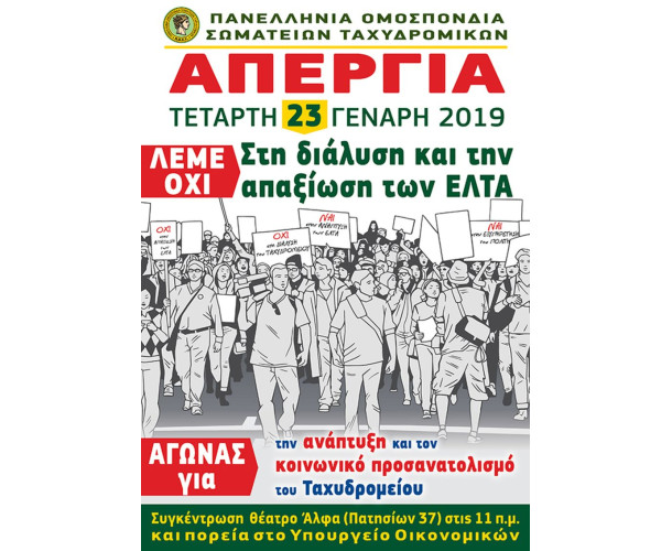 24ωρη ΠΑΝΕΛΛΑΔΙΚΗ ΑΠΕΡΓΙΑ - ΤΕΤΑΡΤΗ 23 του ΓΕΝΑΡΗ 2019. ΟΛΟΙ ΣΤΗΝ ΑΠΕΡΓΙΑΚΗ ΣΥΓΚΕΝΤΡΩΣΗ ΣΤΟ ΘΕΑΤΡΟ ΑΛΦΑ (Πατησίων 37) στις 11 π.μ. ΟΛΟΙ ΣΤΟ ΠΑΝΤΑΧΥΔΡΟΜΙΚΟ ΣΥΛΛΑΛΗΤΗΡΙΟ ΣΤΟ ΥΠΟΥΡΓΕΙΟ ΟΙΚΟΝΟΜΙΚΩΝ,. Ο ΑΓΩΝΑΣ ΜΑΣ ΞΕΚΙΝΗΣΕ. ΒΑΖΟΥΜΕ ΦΡΕΝΟ ΣΤΑ ΣΧΕΔΙΑ ΔΙΑΛΥΣΗΣ ΤΟΥ ΤΑΧΥΔΡΟΜΕΙΟΥ. ΟΛΟΙ ΜΑΖΙ. ΑΓΩΝΙΖΟΜΑΣΤΕ ΓΙΑ ΤΗΝ ΑΝΑΠΤΥΞΗ ΤΩΝ ΕΛΤΑ. ΥΠΕΡΑΣΠΙΖΟΜΑΣΤΕ ΤΟΝ ΚΟΙΝΩΝΙΚΟ ΠΡΟΣΑΝΑΤΟΛΙΣΜΟ ΤΟΥ ΤΑΧΔΡΟΜΕΙΟΥ. ΥΠΕΡΑΣΠΙΖΟΜΑΣΤΕ ΤΑ 190 ΧΡΟΝΙΑ ΙΣΤΟΡΙΑΣ ΚΑΙ ΑΓΩΝΩΝ ΜΑΣ. ΟΛΟΙ ΜΑΖΙ ΕΝΩΜΕΝΟΙ ΘΑ ΝΙΚΗΣΟΥΜΕ.